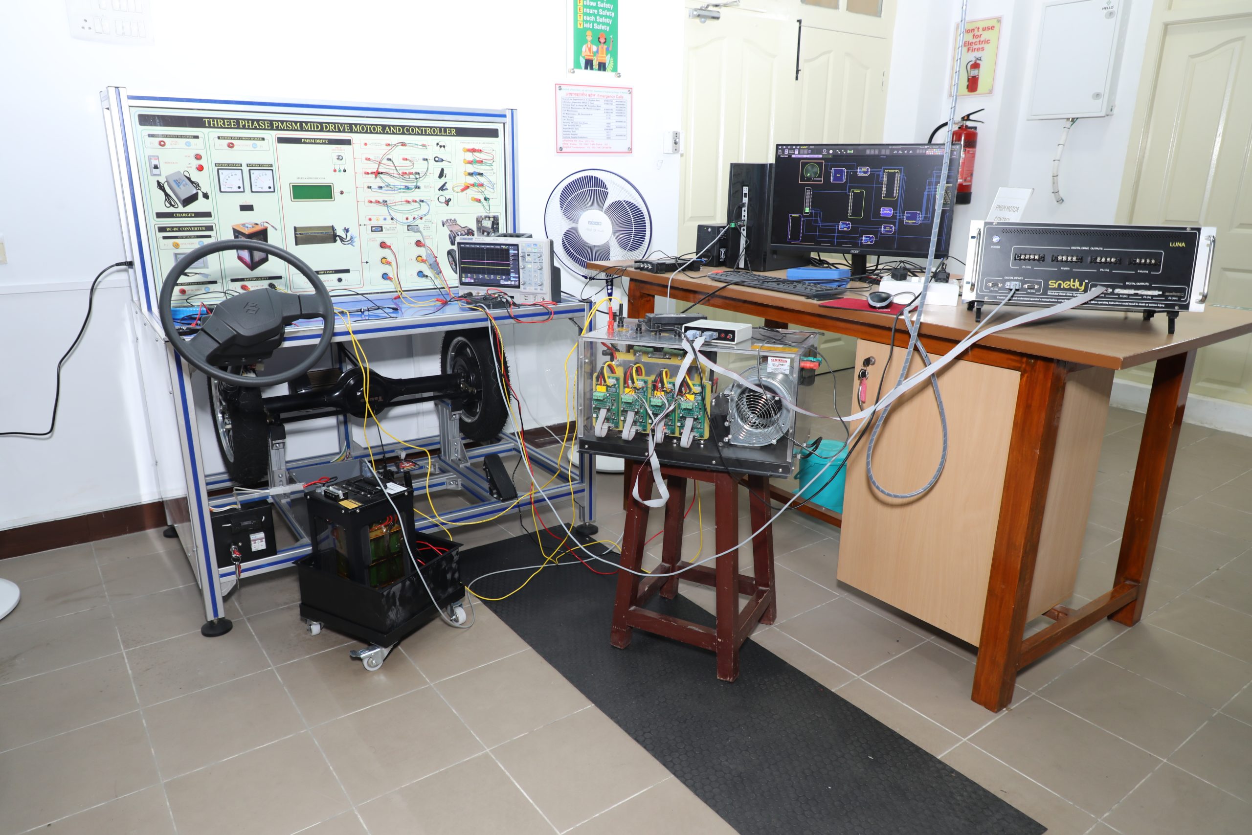 Our Laboratory offers a comprehensive setup for analysing the speed control and drive characteristics of differentially mounted Permanent Magnet Synchronous Motors (PMSM) and Switched Reluctance Motors (SRM) within electric vehicle (EV) powertrains. This facility is designed to enhance understanding of motor performance in real-world applications.
